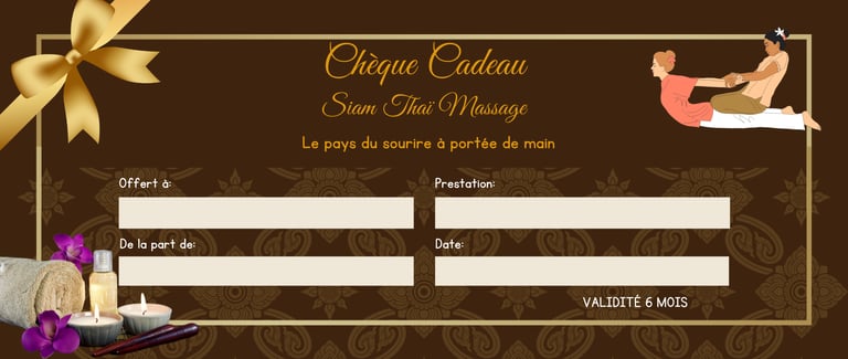 Vous voulez offrir un cadeau original et faire découvrir la tradition thaï à un proche ? Siam Thaï Massage vous offre cette possibilité avec nos bons cadeaux. Vous décidez du montant du cadeau ou du massage que vous souhaitez offrir. Nous transmettons le bon cadeau correspondant au destinataire de votre cadeau, qui vient chez nous pour en profiter. Les bons cadeaux sont valables 1 ans à partir de la date d’achat, ils ne sont ni échangeables, ni remboursables et ne peuvent faire l’objet de compensations financières. Règlement en ligne, sur place ou par correspondance (envoi de chèque ou virement + nom et adresse du bénéficiaire du cadeau).